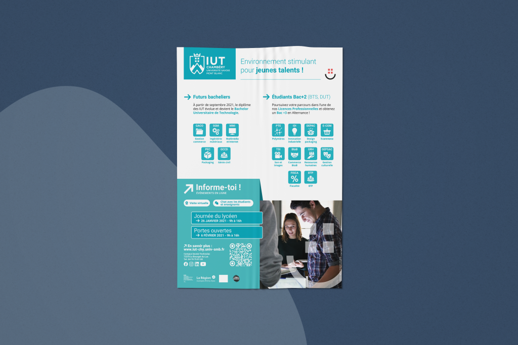 Dès la rentrée 2021, le Diplôme Universitaire de Technologie se métamorphose en Bachelor Universitaire de Technologie. Afin de présenter ces nouvelles formations à ses potentiels étudiants, l’IUT de Chambéry a souhaité renouveler ses plaquettes présentant les formations.